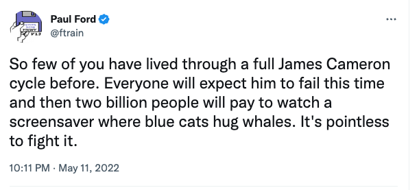 I think the whole ‘cultural footprint’ thing for Avatar isn’t too relevant, the first film made almost $3 billion and I think that and Top Gun Maverick show if you give people A+ action and/or something they’ve never really seen before in a film you can rake it in (I don’t expect this sequel to do nearly as well as the first one but it sounds like it’s got enough wow factor there to give it a chance of big box office again)
