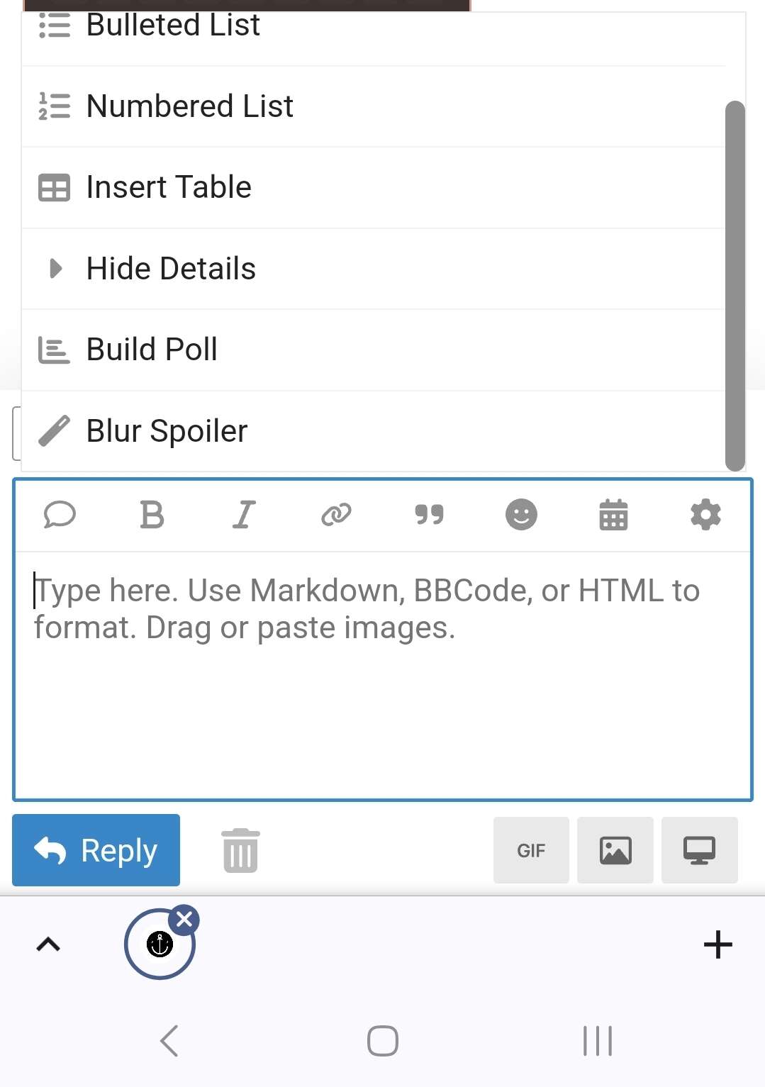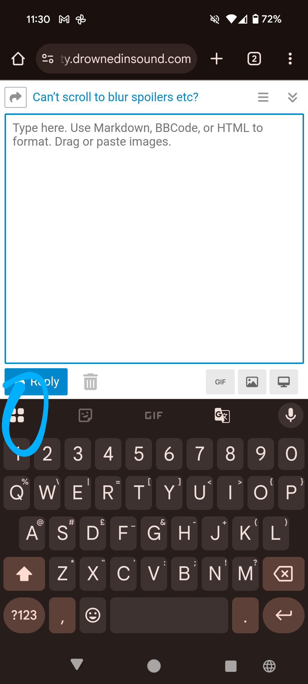 Slight faff, but if you close your keyboard in the OP screenshot then it should just leave the full menu (including spoiler option) in view, which you can then select and go back to typing your post again.