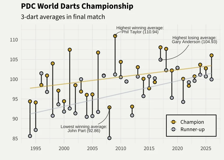 Would be interested to see how the losing player’s average in earlier rounds has changed over time. Feel like the best in the world has stayed at a fairly consistent level from Taylor to MVG to Humphries to Littler. The top 5 or so has gone up a bit but the 6-32 area has absolutely shot up in the last 5-10 years