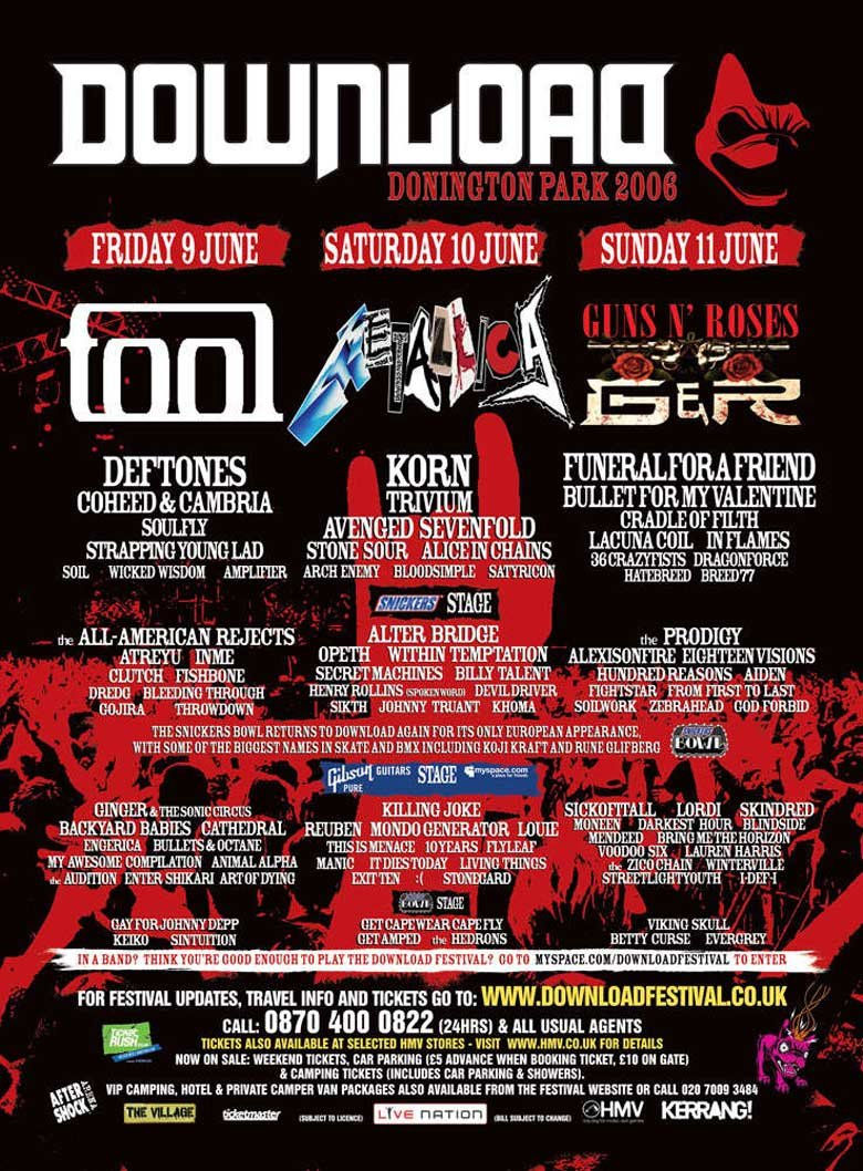 Reckon I saw about 30 bands at this, partly because I assumed that’s what you were supposed to do at festivals and partly because there was fuck all else to do. Main memories are Will Smith showing up during Wicked Wisdom’s (Jada Pinkett-Smith’s godawful nu-metal band) set, Strapping Young Lad being absolutely amazing, Tool’s visuals not really working in broad daylight and Metallica showing up nearly an hour late (16 year old me thought this was a fine and normal thing for bands to do).