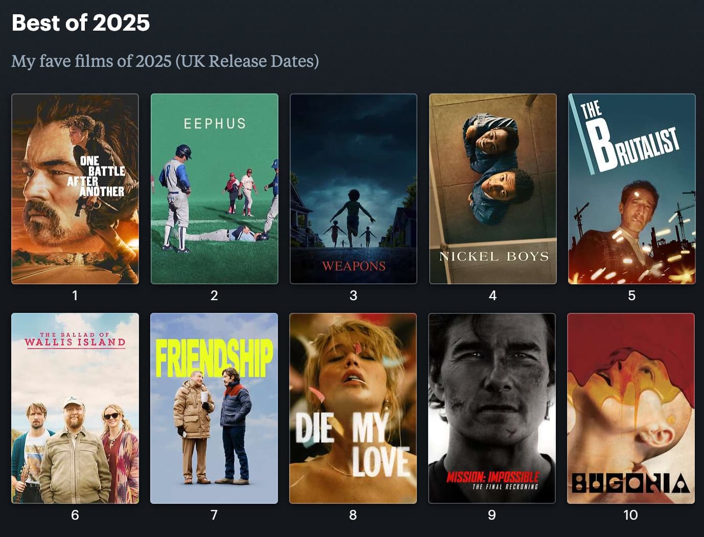 Yet to see Sentimental Value and Marty Supreme so might have a re-jig in a week or so.