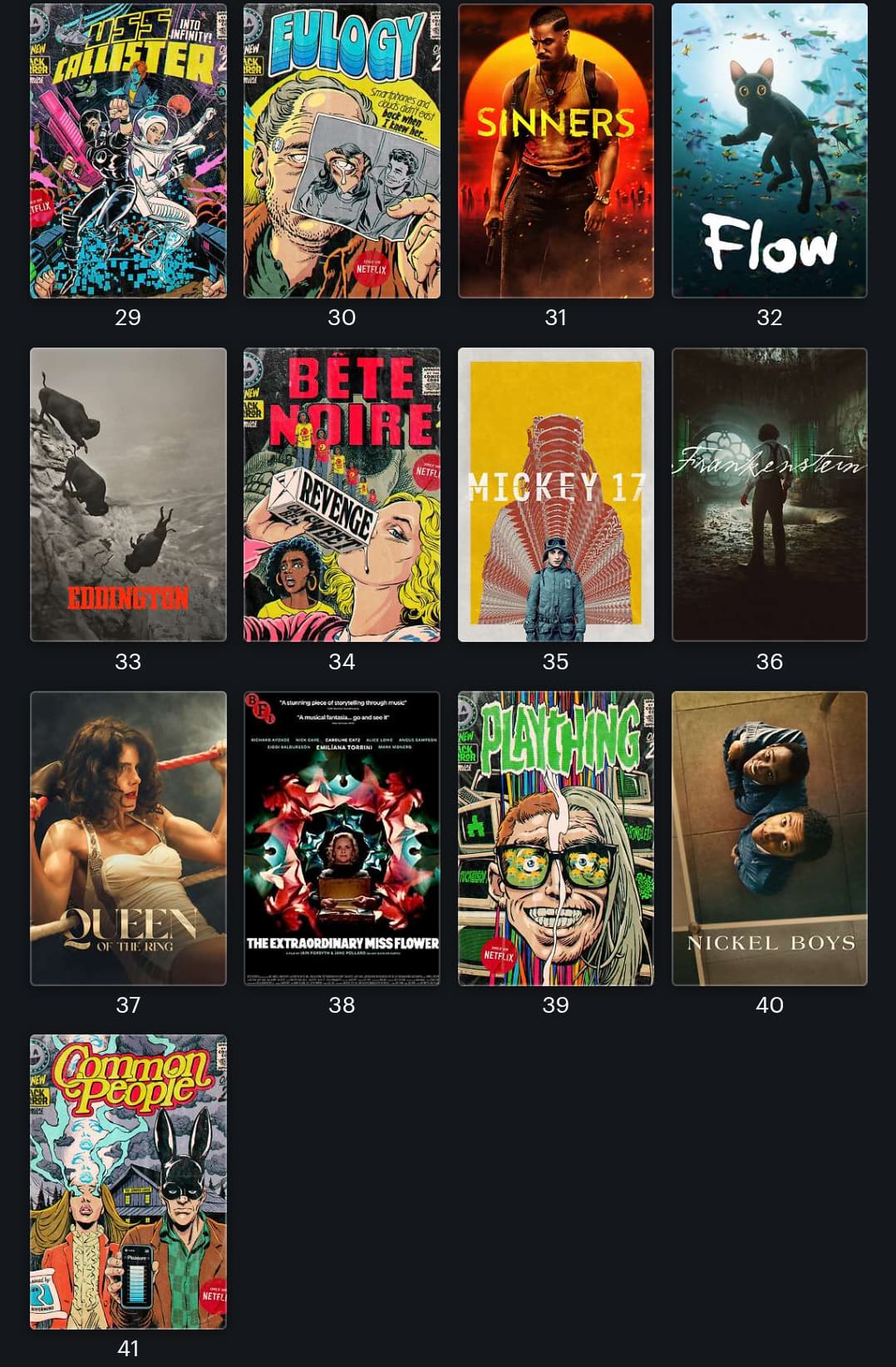 managed to sneak Marty Supreme in time to bump my list up to 40 for the year, which is about standard for me though a bit down on last year’s 47 high