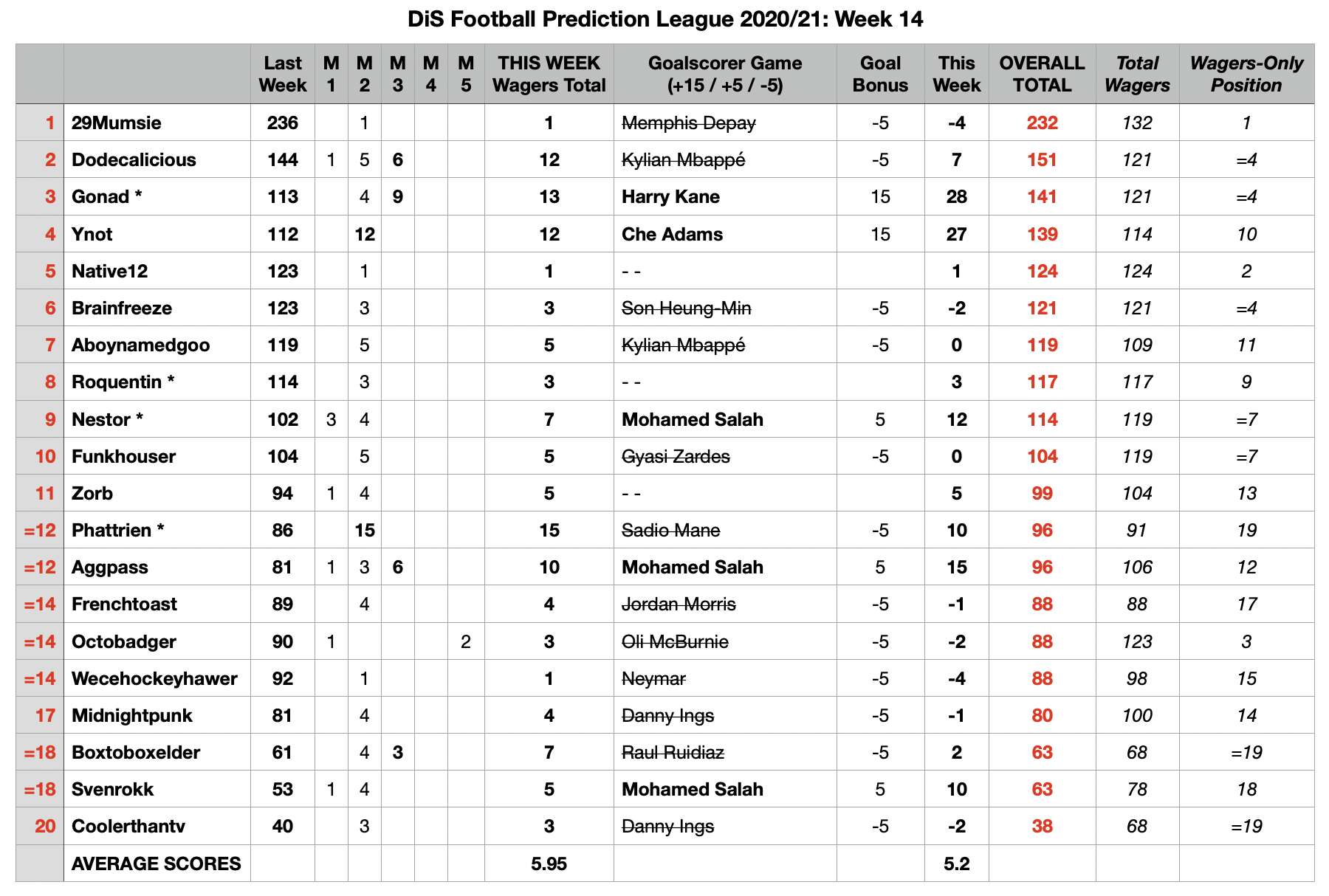 For the week after this, I might do a double-week, five fixtures on the 26th and five on the 27th (all 5-1 as normal, two separate rounds). But might make it so the 27th only counts if everyone plays just in case people aren’t around in that week before Xmas. Does that seem fair?