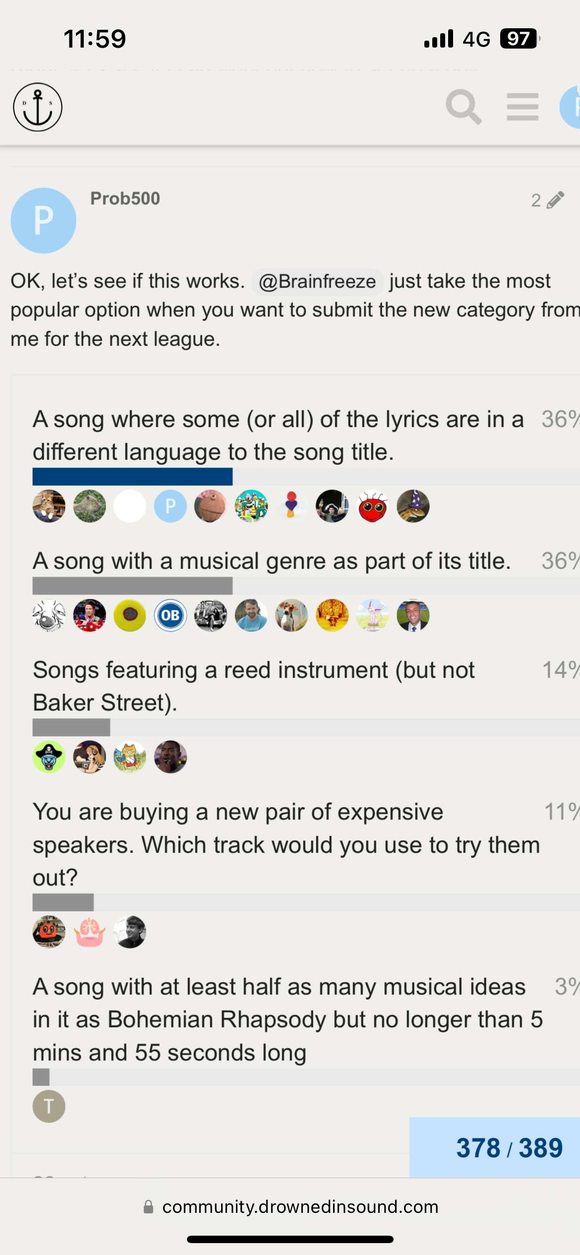 Pick a track based on the theme. It goes into a playlist. We listen. We vote. We move up and down the league and get really narked by rules and details.