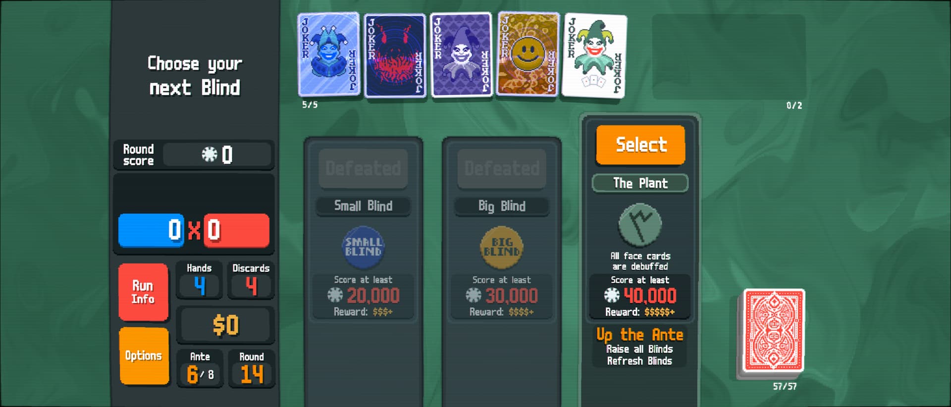 On my next run I thought I was being clever as had a load of jokers working around face cards, one being all cards are considered face, until I got to the ante 6 boss and the blind was all face cards are drawn down. At first I was like what are the chances! Took a couple of discards before I realised what was going on.