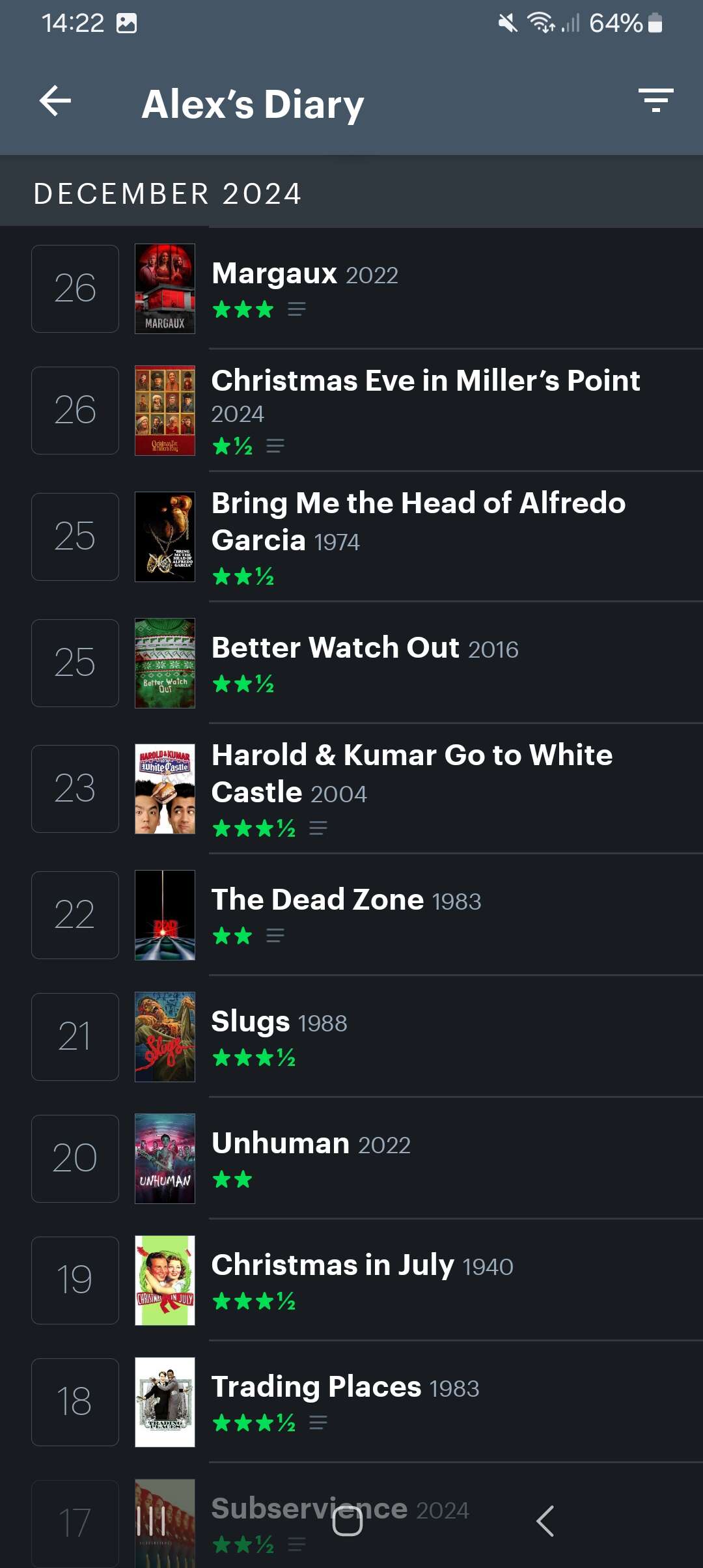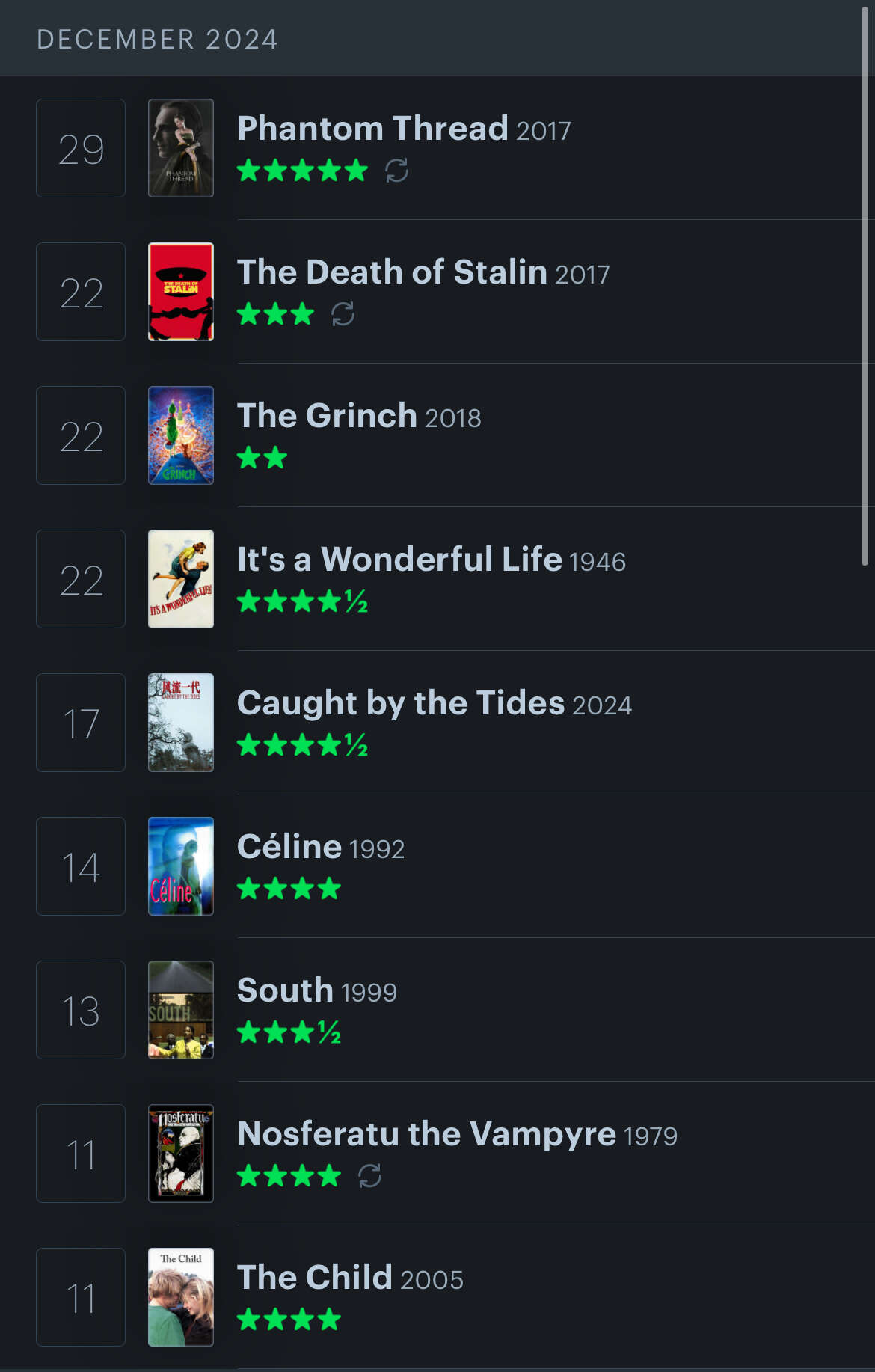 December was almost entirely re-watches for me, except for Your Father was Born 100 Years Old, So Was the Nakba (short about Israel’s colonisation of the filmmaker’s father’s village in Palestine), An Ostrich Told Me the World Was Fake and I think I Believe It, A Charlie Brown Christmas and The Promised Land (didn’t hit as hard as I hoped, still good)