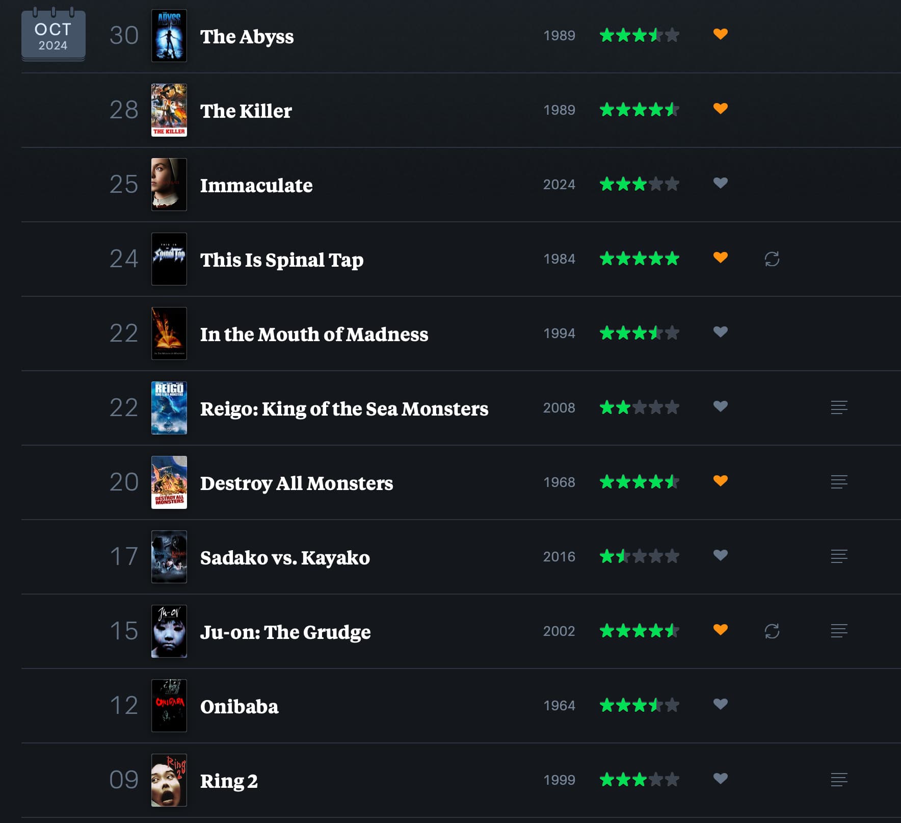 best: The Grudge, The Killer, Spinal Tap, even if it was the 800th time Iâve watched it
